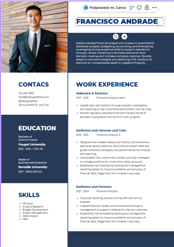 Open your template in Canva with one click. Customize your name, experience, skills, and colors — no design skills needed.